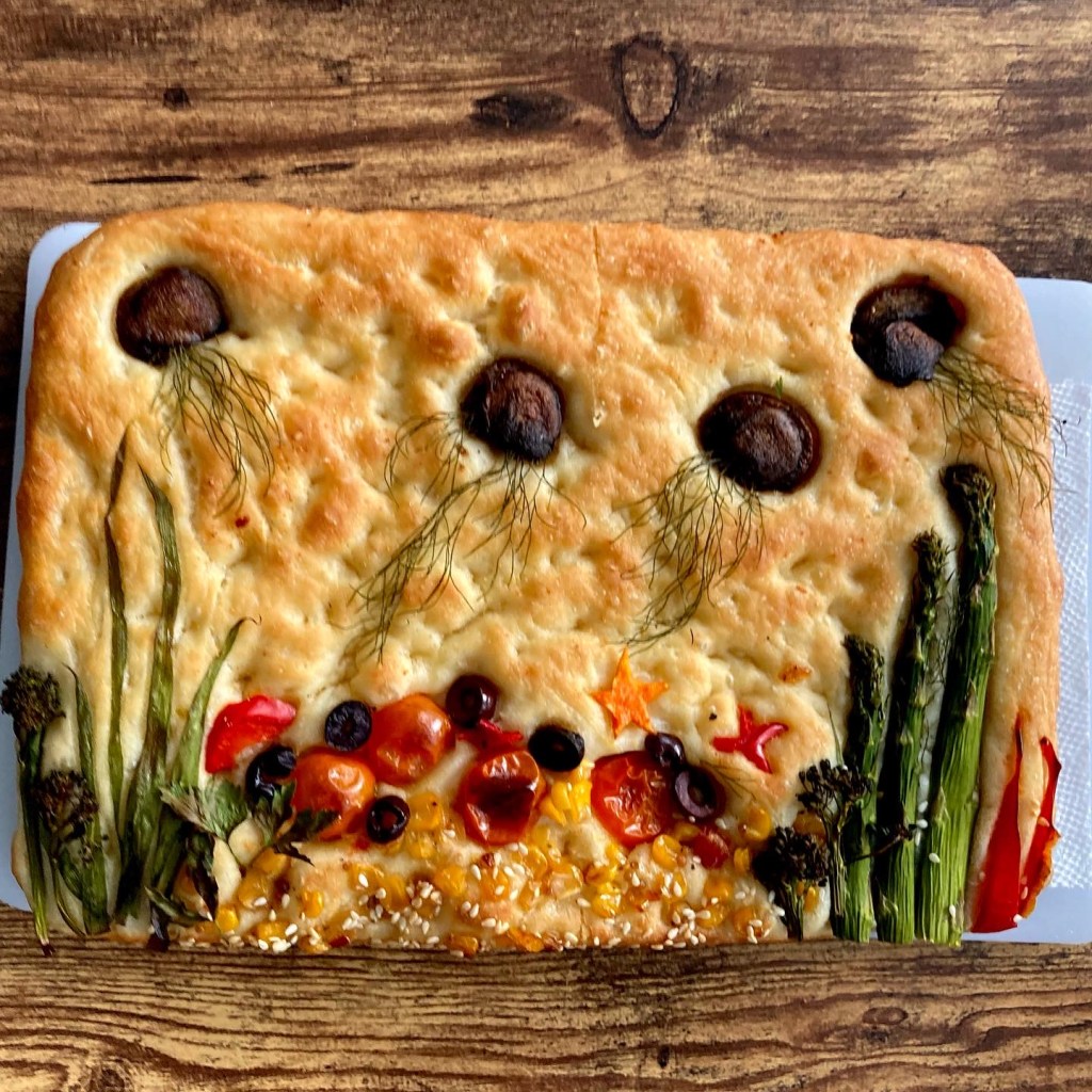 The last focaccia I had attempted was a disaster- let’s just say one wouldn’t call it bread. But as they say, time does heal all wounds and so here I was giving this an even more ambitious shot. While on the search for ideas on landscaping the focaccia, all I found were pages and pages of gardens, flowers, trees crafted on the golden bread. And so I hit up sanahrizvi.art for some creative brainstorming- I emptied out my fridge and pantry of everything edible and colorful and with the help of her imagination, we came up with a rough sketch of the focaccia design. Pictures are better than words when it comes to food so here is a photo journey of how the bread came along: