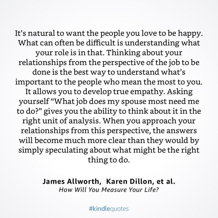 The definition of love varies from person to person. Gary Chapman came up with the theory of “love languages” to simplify certain ways in which people prefer expressing love and affection. Christensen offers an alternative lens. When approaching a relationship, ask what is your partner’s needs and what you can do to fulfill them. Often a times, we act in ways we deem fit and not in ways that your partner needs. Communication is key in understanding what is your “job to be done” in the relationship in order to keep your partner happy.